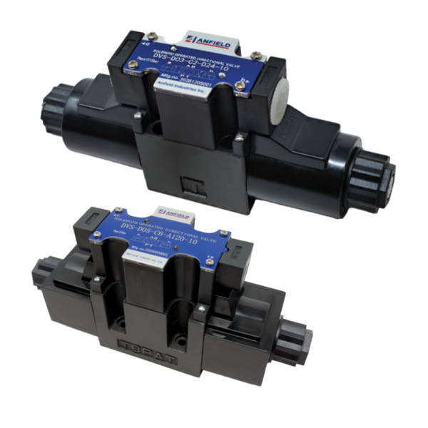 Anfield DVS series solenoids actuated directional control valves are used to manage the direction of flow in hydraulic circuits. NFPA D03, D05 industry-standard subplate mountable. The DVS valves are rated for 4568 psi (315 bar) and used for low-to-medium flow applications with the D03 size suited for 8-15 gpm, while D05 valves are larger, supporting higher flow rates typically up to 30 gpm, in both cases depending on the spool type. Moving core immersed in hydraulic oil provides quiet operation.
