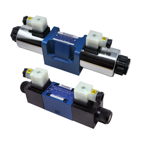 Anfield DVSH series solenoid actuated directional control valves are used to manage the direction of flow in hydraulic circuits. NFPA D03, D05 industry-standard subplate mountable. The DVSH valves are rated for 5076 psi (350bar), and used for low-to-medium flow applications up to approximately 15-20 gpm, while D05 valves are larger, supporting higher flow rates typically up to 39 gpm, in both cases depending on the spool type. Moving core immersed in hydraulic oil provides quiet operation.